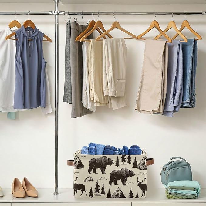 Aslsiy Storage Vintage Deer Bear Moose Nursery Bins National Park Baby Box Canvas Clothes Shelf Basket Laundry Hamper Gift for Home Closet 2 Pcs