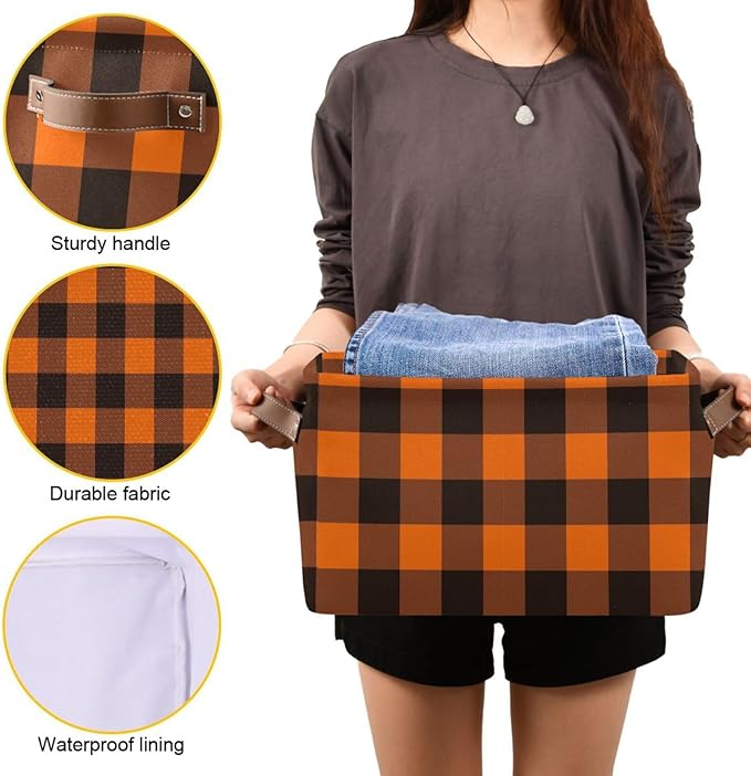 Aslsiy Storage Basket Orange Black Plaid Nursery Bins Baby Box Canvas Clothes Shelf Basket Laundry Hamper Gift Basket for Home Closet 1 Pcs
