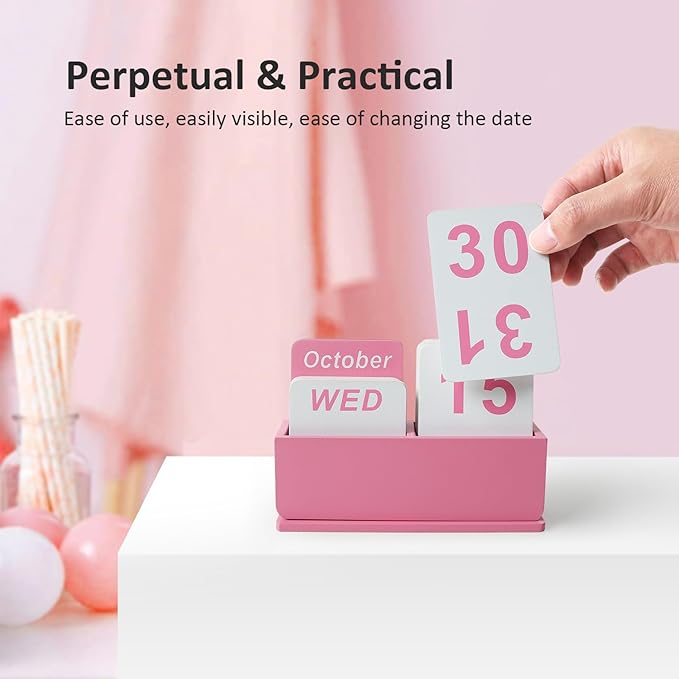 Wooden Block Perpetual Calendar for Desk, Daily Desktop Standing Flip Calendar with Large Display, Modern Farmhouse Aesthetic Desk Accessories for Home Office Decor, Reusable Yearly, Pink
