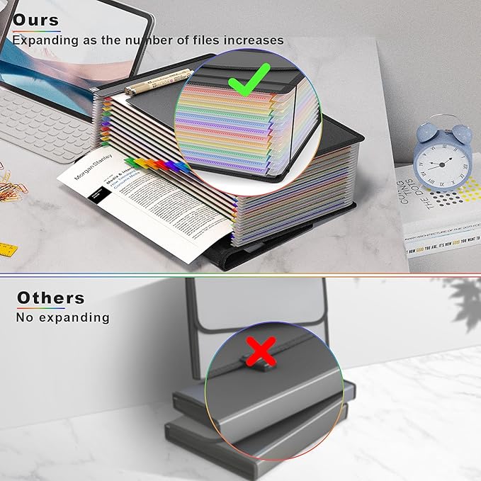 - 【Super Portable and Secure Closure】: Compared with other bottom expandable accordion folders, a handle is added, which makes it very easy to move. Other file folders with a plastic handle usually cannot expand at the bottom, which greatly limits its usable capacity. Our folder does not have this trouble. It is easy to move and has enough capacity.ABS Buckle and elastic band provide perfect secure closure.