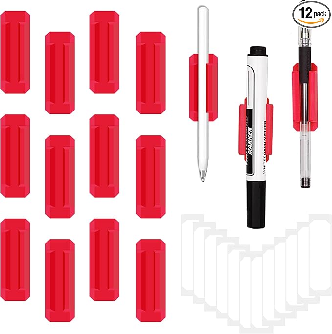 12 Pack Pen Holder for Desk, Silicone Pencil Holder with 12 Extra Adhesive Stickers, Adhesive Pen Holder & Marker Clip for Classroom Office Desk or Any Surface, Teacher Accessories Supplies (Red)