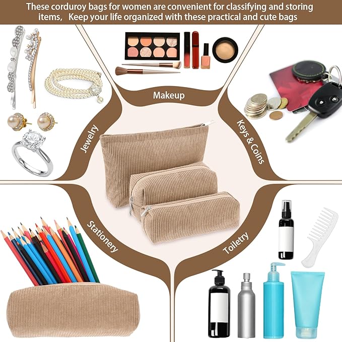 - Material and Attractive Design: the makeup and toiletry travel bag set is mainly crafted from quality corduroy material, ensuring high durability and prolonged service life; The bags feature solid khaki color design in different sizes; This makes them compatible with various styles of outfits
