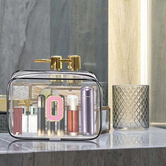 Clear Toiletry Bag,Portable Travel Toiletry Bag,Chenille Letter Cosmetic Bag with Zipper,Waterproof Makeup Bag,Cosmetic Storage Organizer for Women Men,Travel Essentials (Black,A)