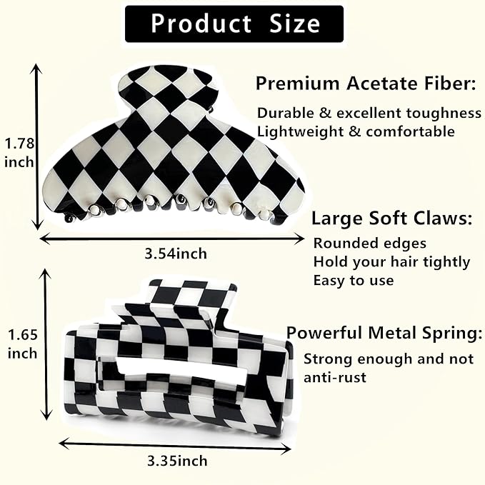 - Secure Hold for All Hair Types: these checkered hair claw clips offer a secure, slip-free hold with rounded teeth. Perfect for styling thick, thin, curly, or straight hair without causing damage.