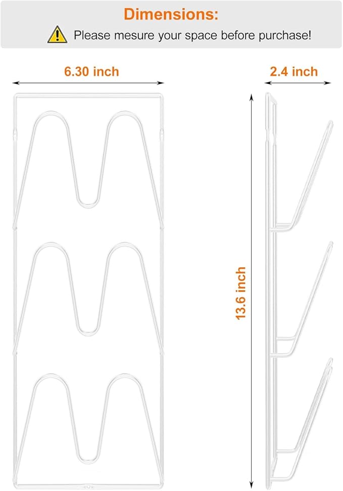 - 100% WARRANTY: Dimensions of the pot lid storage rack are 6.3 x 2.4 x 13.6 inches. Includes 2 x Lid organizer rack, 4 x Adhesive sticker, 6 x Nail, 6 x Plastic anchor, if there are missing parts or other problems, please do not hesitate to contact us.