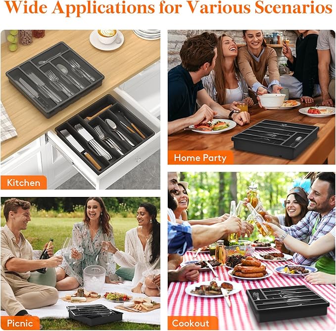 - Portable Design: Our flatware organizer for drawer is versatile and can be used for more than just organizing kitchenware. Its lightweight design makes it ideal for various occasions such as home parties, cookouts, picnics, camping, RV travel, and other outdoor events