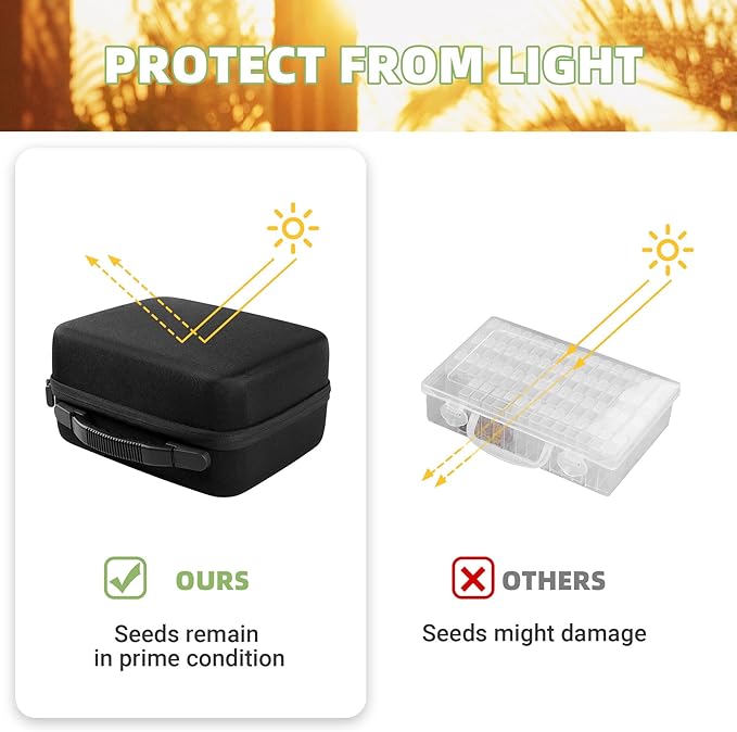 - Safety Seed Organizer Storage Box: Our garden seed organizer kit includes a black EVA seed organizer box that not only looks great but also serves a vital purpose - light protection. The black color effectively blocks out harmful light, preserving the viability of your seeds. The seed storage box is designed to be durable, with a secure zipper closure and a convenient handle for easy transportation. Inside, a specially designed sponge securely holds each seed storage tubes, ensuring stability.