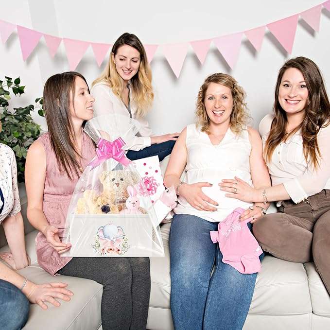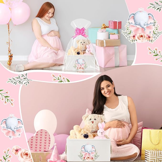 Pickmesh Baby Shower Storage Basket with Gift Bags Rectangular Ribbons Collapsible Canvas Storage Bin with Handles for Diaper Organizing Toy Home DIY Gift Basket, 13 x 9. 1 x 7. 1 Inch(Pink Elephant)