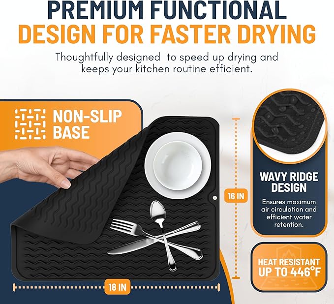 - SUPERIOR DRYING & ABSORPTION: Featuring raised ridges and deep grooves, our dish drainer mat ensures maximum air circulation for rapid drying, outperforming traditional cloth mats in both speed and countertop maintenance. Unlike microfiber options, our silicone dish drying mat is designed to maintain a cleaner countertop by effectively managing moisture. Experience enhanced water absorption and quick-drying technology to keep your kitchen space clean and efficient