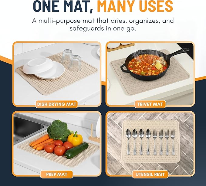 - VERSATILE KITCHEN ESSENTIAL: Elevate your kitchen space with our multi-functional Drying Mat for Kitchen Counter. Crafted from robust and flexible silicone, this kitchen drying mat excels beyond simple dish drying. Utilize it as a heat-resistant pot holder, protective trivet, convenient spoon rest, or a prep area for ingredients. It even serves as an ideal pet feeding mat