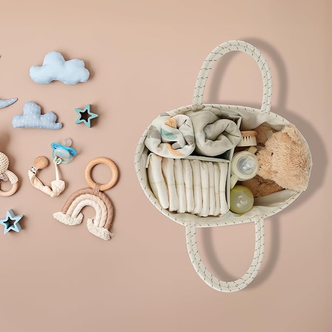 - Flexible and Portable Diaper basket with removable divider: Featuring handles for effortless transportation, our diaper change caddy includes removable dividers for personalized organization. Adjust the internal layout as needed to accommodate various baby items. Move seamlessly from room to room or take diaper organizer caddy on the go for convenient access to baby essentials.