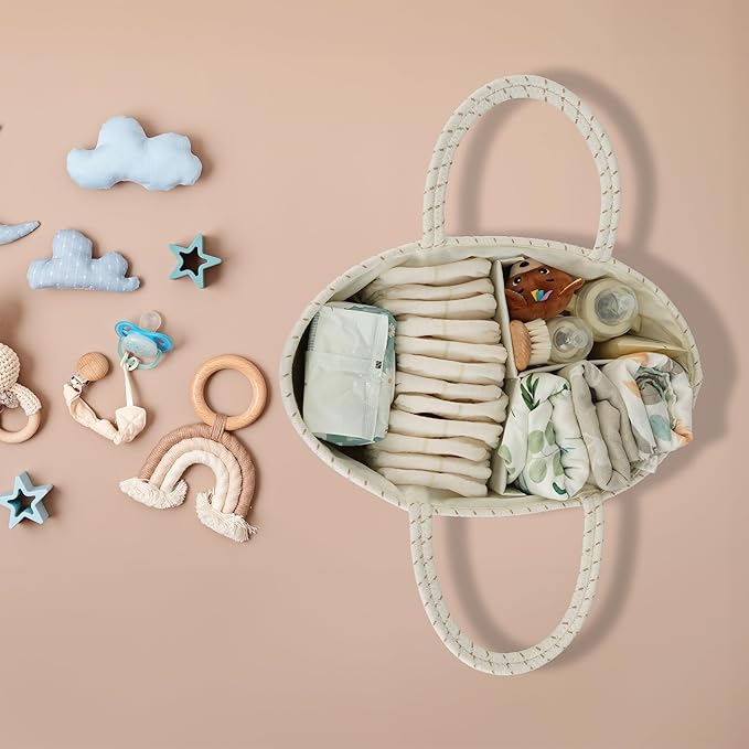 - Flexible and Portable Diaper basket with removable divider: Featuring handles for effortless transportation, our diaper change caddy includes removable dividers for personalized organization. Adjust the internal layout as needed to accommodate various baby items. Move seamlessly from room to room or take diaper organizer caddy on the go for convenient access to baby essentials.