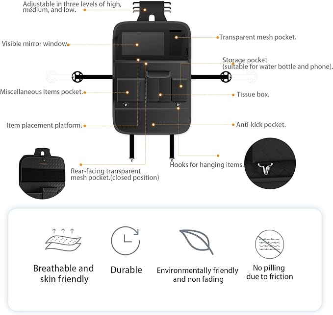 - [Car Seat Organizer]-We use safe, thick, and high-quality durable materials to make a rear seat organizer for children.Enjoy the support plastic strips, sturdy straps, and reinforced buckles on their tops.