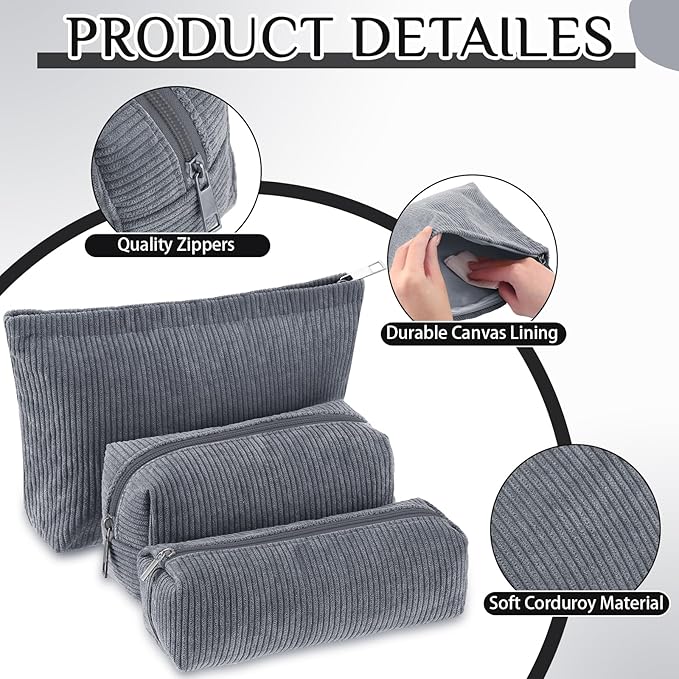 - Material and Attractive Design: the makeup and toiletry travel bag set is mainly crafted from quality corduroy material, ensuring high durability and prolonged service life; The bags feature a vibrant gray color surface, makes them compatible with various styles of outfits