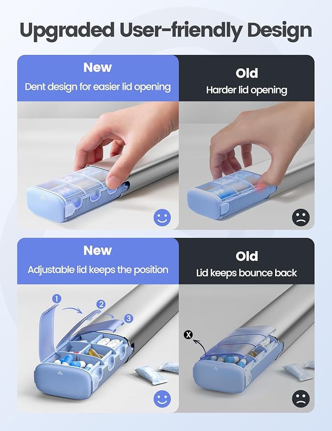 - 【Revolutionary Moisture-Prevention Design】Featuring a pioneering drying agent chamber and individual lids for each compartment, our pill case sets new standards for keeping medications dry and safe. This innovative travel pill organizer feature safeguards your medication from moisture, essential for maintaining pill efficacy and longevity. It is especially vital as part of your travel essentials for both women and men alike.