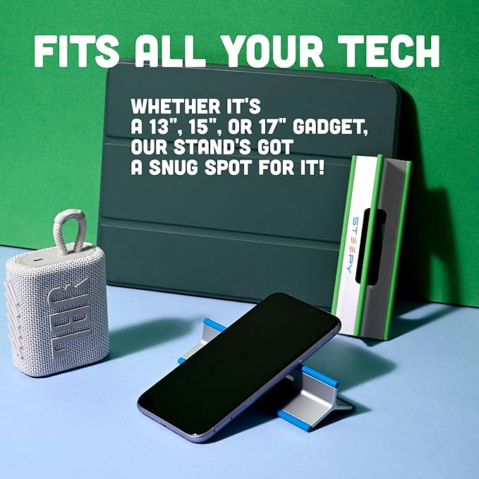 - SETUP'S A BREEZE - Just unfold and go—no screws, no hassle. Instant use, instant time saver! Steepy desk laptop stand is a travel laptop stand made out of strong and durable recycled plastic, with rubber edges to provide the sturdy and stable support your device needs and prevent it from sliding or skidding.