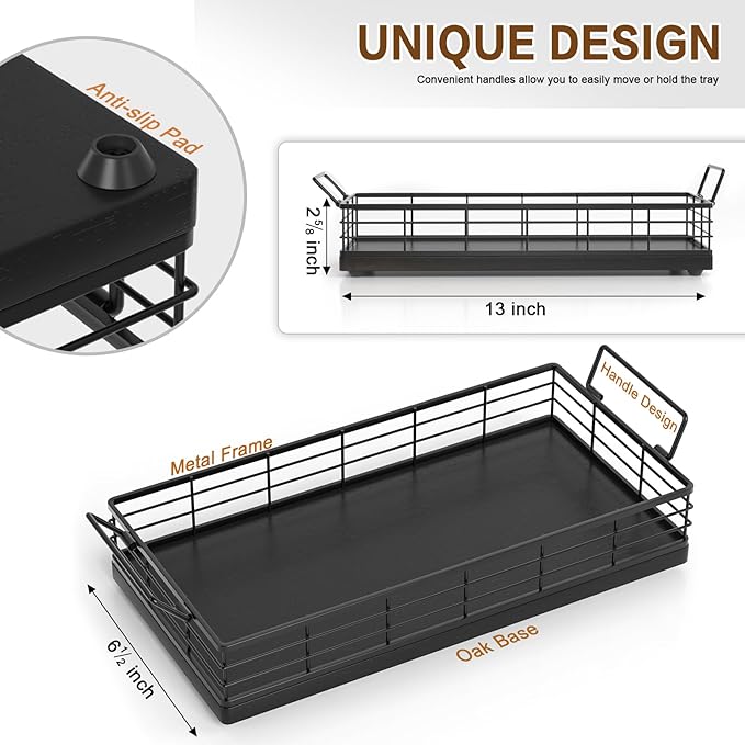 Toilet Paper Basket, 13 Inch Oak and Iron Tank Tray Top of Toilet Storage Toiletries Organizer for Bathroom, Living Room and Kitchen (Black)
