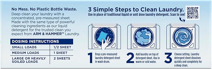 - ARM & HAMMER Power Sheets Fragrance Free Laundry Detergent; these detergent sheets clean up to 100 small loads when using ½ sheet, or 50 medium loads when used as directed