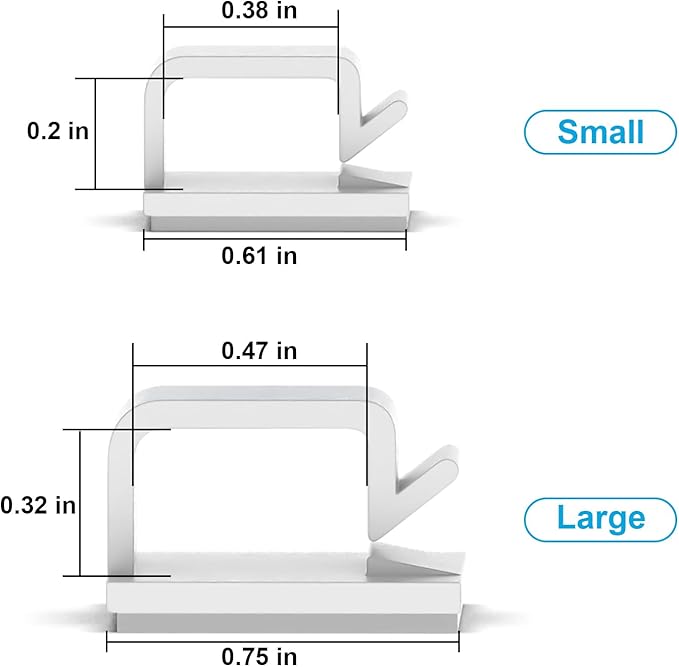- Size information: Small size wire clips: Base 0.63’’x 0.61’’, Inner Height 0.2’’. Large size cord clips: Base 0.75’’x 0.75’’, Inner Height 0.32’’.