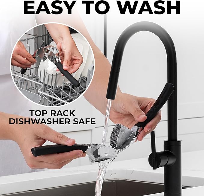 - EASY TO CLEAN: Simply rinse your garlic and ginger press tool under running water and use the included cleaning brush to get rid of any garlic bits or place it in the dishwasher for a quick clean up. Can be washed on the top rack dishwasher but hand wash is suggested. We recommend rinsing the garlic crusher right after use to avoid residual pulp and fibers hardening up.