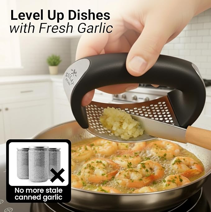- CRUSH GARLIC EFFORTLESSLY: Tired of getting garlic all over your hands and workstation? This garlic press rocker saves you time and effort for your by pressing garlic easily! It is is made from high-quality 304 stainless steel that is built to last even the most pressing tasks!