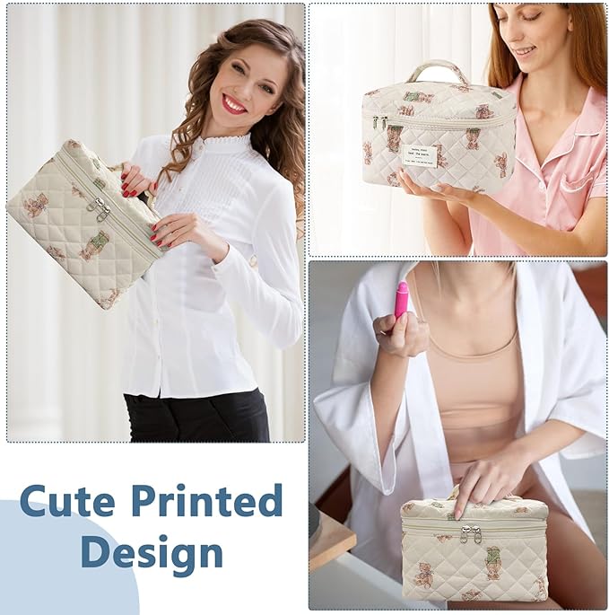 Large Makeup Bag, Cute Cosmetic Bag for Women Girls, Floral Coquette Aesthetic Toiletry Bag, Travel Make Up Organizer Bag (White-Bear)