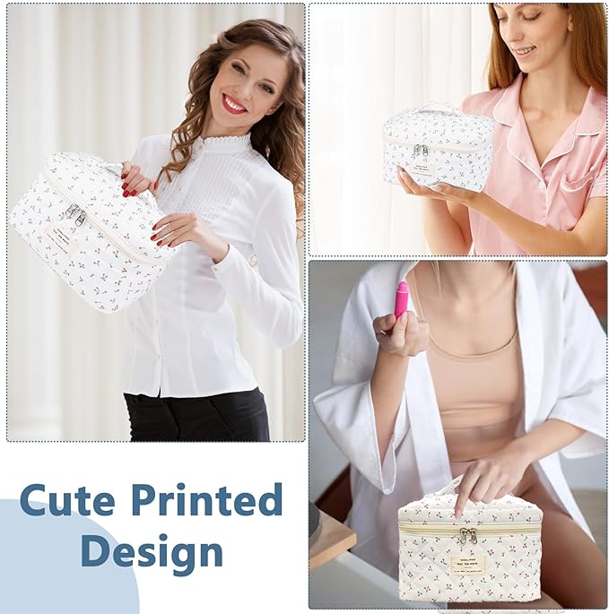 Large Travel Quilted Makeup Bag for Women,Big Floral Cotton Cosmetic Bag, Cute Coquette Aesthetic Floral Toiletry Organizer Bag (White Cherry)