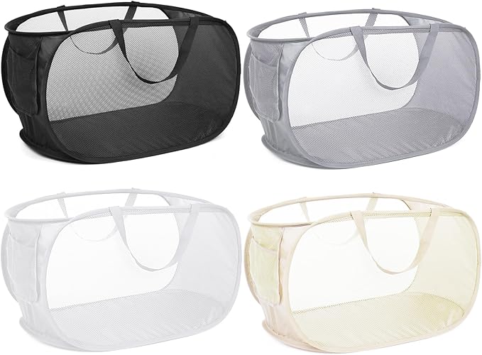 4 Pack Foldable Laundry Basket Hamper, Collapsible Laundry Baskets with Pocket, Mesh Pop Up Laundry Hamper, Clothes Hamper with Reinforced Handles for Laundry, Bathroom, Kids Room, Dorm or Travel
