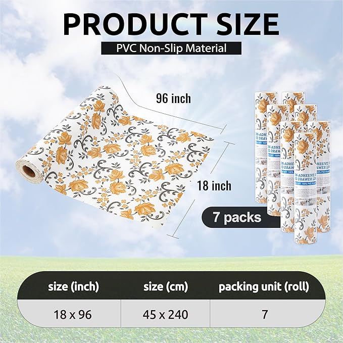 - Excellent Material - The shelf liners are made of excellent PVC material that is non-adhesive and non-slip. To reduce slipping and bunching in your drawers or cabinet shelves, we have added a non-slip texture design on the bottom that increases friction, keeping the liner in place on surfaces and preventing items from moving.
