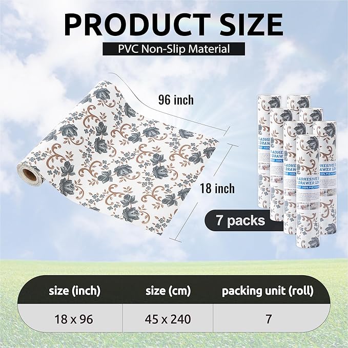 - Excellent Material - The shelf liners are made of excellent PVC material that is non-adhesive and non-slip. To reduce slipping and bunching in your drawers or cabinet shelves, we have added a non-slip texture design on the bottom that increases friction, keeping the liner in place on surfaces and preventing items from moving.
