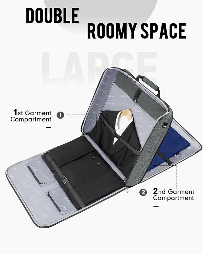 - UNIQUE DOUBLE LAYER DESIGN: MATEIN travel garment bags offer two separate compartments for hanging garments, each interior with 3 loop holders easily hanging 3 full suits, 3 interior ties down straps and middle foam padded strap, keep your suits securely in place, neat and wrinkle-free. Carrying this garment bag enhances the ease and enjoyment of your business trip