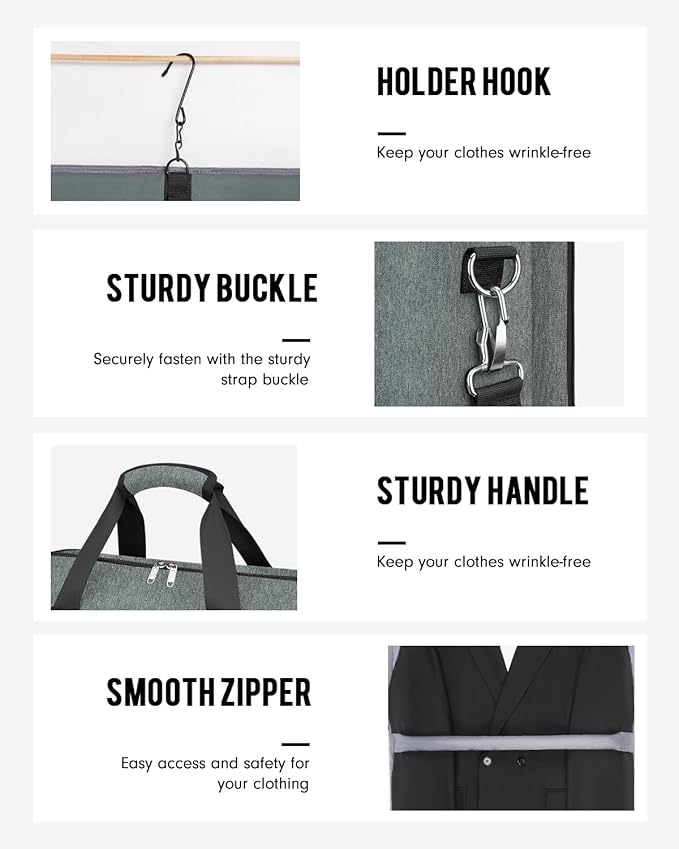 - EXCEPTIONAL DURABILITY FOR LONG-LASTING USE: Our travel hanging garment bag is crafted from superior, water-resistant polyester fabric that's built to last. It features robust two-way zippers, stylish metal buckles and a sturdy exterior fabric that's both tear-resistant. The soft and sturdy interior lining adds an extra layer of protection. This premium material ensures longevity. It is well-suited for business trips, weddings, meetings, and more
