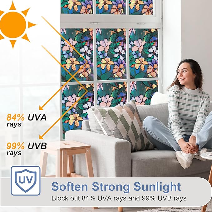- UV Protection & Heat Control: This window cling privacy film blocks more than 84% of UVA rays and 96% of harmful UV rays, reduces glare up to 79%, preventing furniture from fading and keeping your home cool and comfortable, protecting your skin and eye.