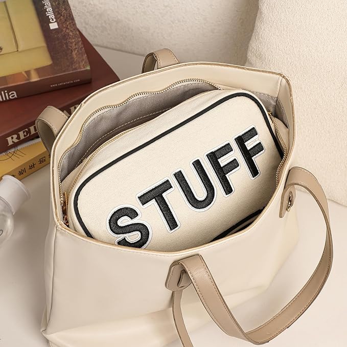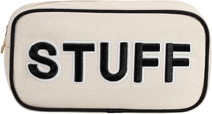 uekeboag Canvas Chenille Letter Stuff Makeup Bag,Small Travel Washable Organizer Bag for Purse with Zipper, Cute Personalized Preppy Cosmetic Bag For Women and Girls(01Black-Stuff)