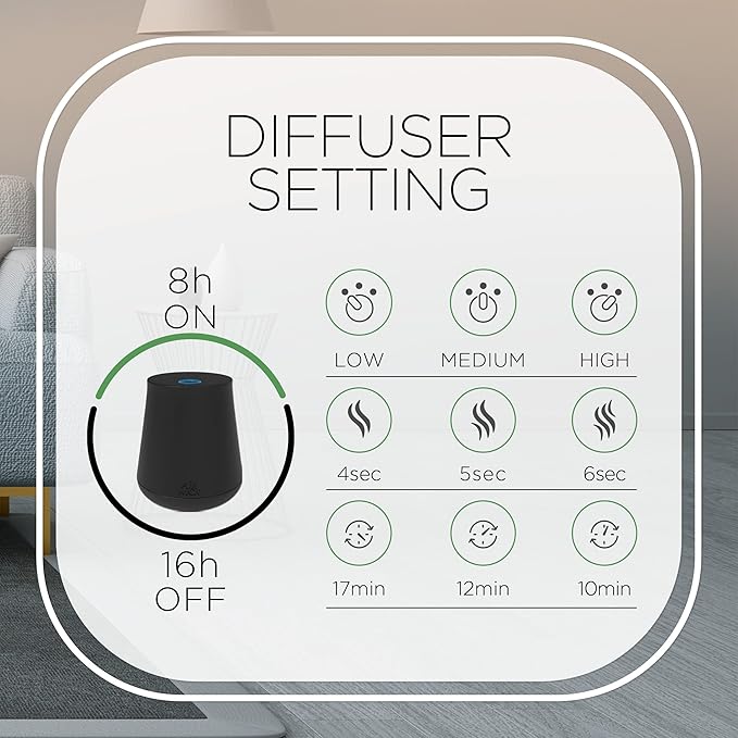 - ADJUSTABLE TO YOUR LIKING: Gadget begins with a 2X initial fragrance boost that fills the room. Then, the device will run for an 8-hour cycle, releasing mist regularly and will then go into standby mode for 16 hours. Control frequency of mist: Low – 4 sec. Mist (17 min Pause), **Medium – 5 sec. Mist (12 min Pause), ***High – 6 sec Mist (10min Pause)