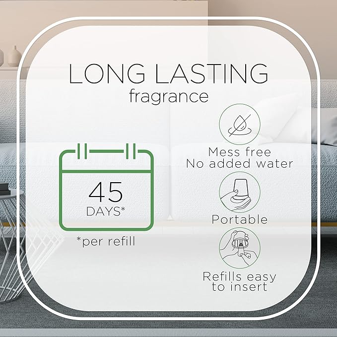 - VALUE: Each refill provides up to 45 days fragrance based on low setting, no need to add water, each refill comes ready to use, easy to change out the refills