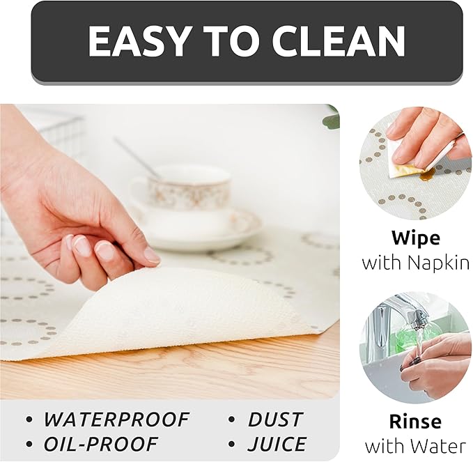 - Details of Shelf Liner - The size of each shelf liner is 18*96 inch, We've looked into the dimensions of many shelves and cabinets, in addition to the 18inch width, we also added 16inch and 12inch widths to ensure customers can choose the size they want. Moreover, our shelf liner is easy to clean with a towel because it is waterproof and oil-proof.