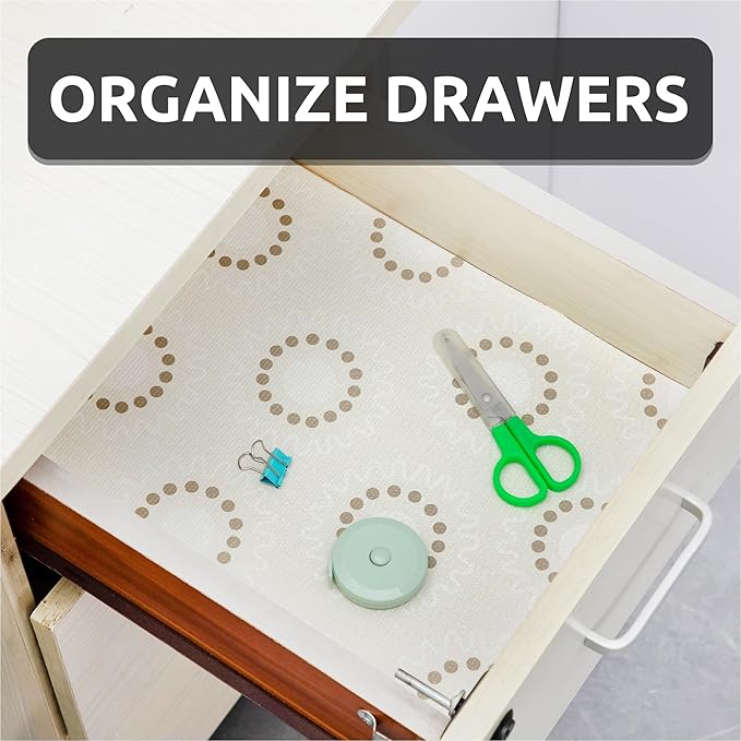 - Excellent Material - The shelf liners are made of excellent PVC material that is non-adhesive and non-slip. To reduce slipping and bunching in your drawers or cabinet shelves, we have added a non-slip texture design on the bottom that increases friction, keeping the liner in place on surfaces and preventing items from moving.