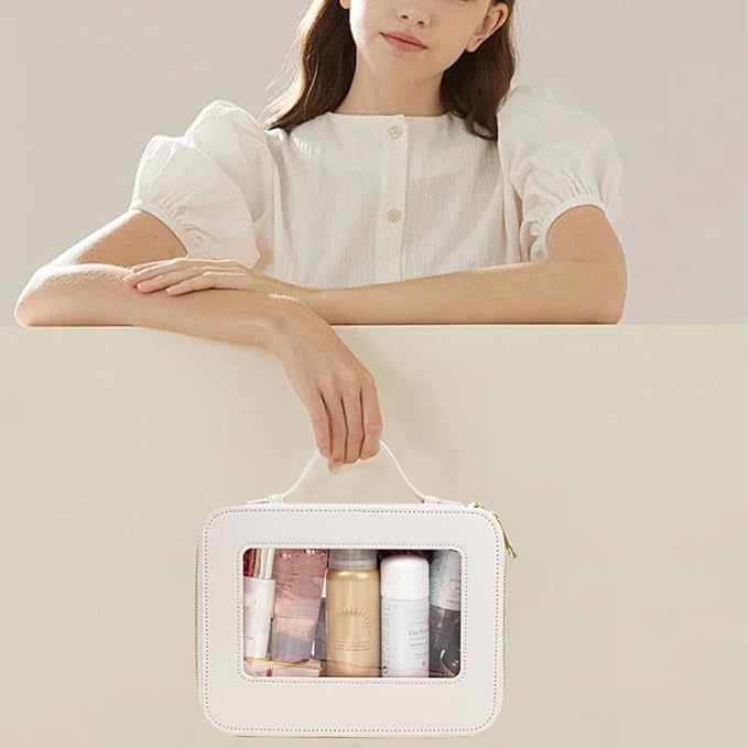 - Clear Design: Our clear toiletry bag with handle is sleek and minimalistic look for your makeup accessories collection. And is designed with a transparent PVC window,all items are clear at a glance, and you can quickly choose the cosmetics you need.Portable and lightweight Slip it into your purse, backpack, everyday tote or travelling bag for easy access to your must-have items. Size:8.52“ * 6.38” * 2.87“.
