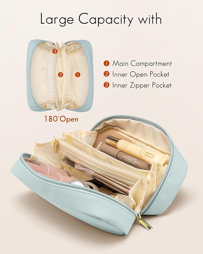 - 180°Opening Design: Travel makeup bag with wide mouth open design,provide a clear view of all your travel essential makeup items, easy to store lipsticks,brushes,skin care