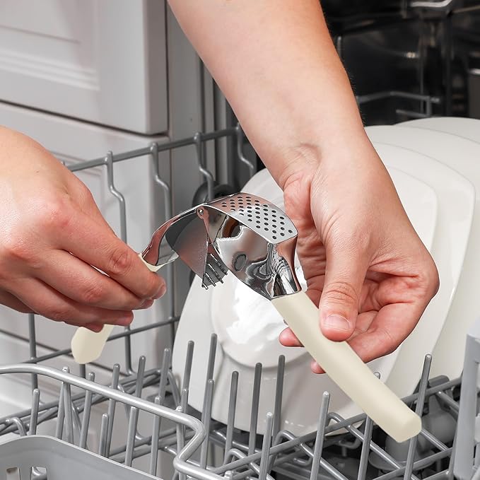 - EASY TO CLEAN: Simply rinse your garlic and ginger press tool under running water and use the included cleaning brush to get rid of any garlic bits or place it in the dishwasher for a quick clean up. Can be washed on the top rack dishwasher but hand wash is suggested. We recommend rinsing the garlic crusher right after use to avoid residual pulp and fibers hardening up.