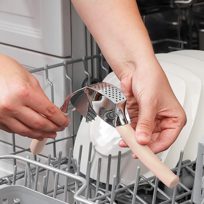 - EASY TO CLEAN: Simply rinse your garlic and ginger press tool under running water and use the included cleaning brush to get rid of any garlic bits or place it in the dishwasher for a quick clean up. Can be washed on the top rack dishwasher but hand wash is suggested. We recommend rinsing the garlic crusher right after use to avoid residual pulp and fibers hardening up.