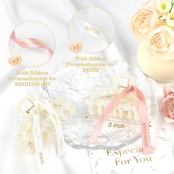 - Ideal Bridesmaid Gift - This product features a set of 8 pearl hair clips, each measuring approximately 3 inches in length and 2 inches in width. Each clip is adorned with a delicate white ribbon with golden 'BRIDESMAID' lettering, adding a touch of elegance and charm. These clips make for beautiful accessories to fill your bridesmaid proposal gift boxes.