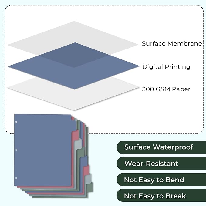 - Premium Material - The dividers with tabs are made of 300 GSM paper, not easily break or bend. Surface membrane technology makes the digital printing pattern of cute binder dividers waterproof, and more wear-resistant