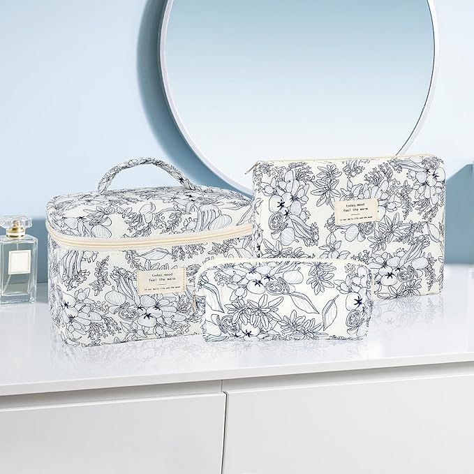 - LIGHT WEIGHT AND EXCELLENT WORKMANSHIP: The quilted cosmetic bag set is made of cotton and is comfortable, soft and lightweight. The makeup bag organizer folds up when not in use and fits in a large bag without taking up space. The metal zipper pull keep your items secure and organized inside