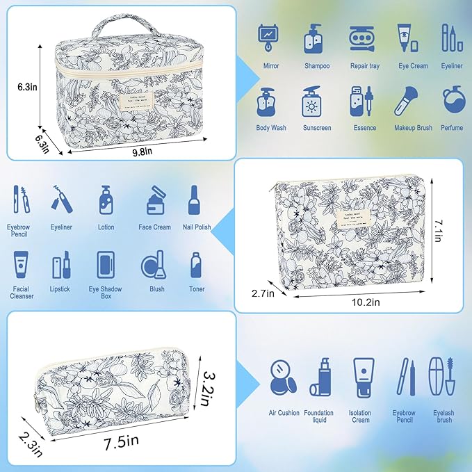 - PERFECT SIZE AND LARGE CAPACITY: Our cute quilted makeup bag measures 9×6. 7×5. 9 inches,10. 2×7. 1×2. 7 inches and 7. 48×3. 14×2. 36 inches, easy to carry. The cotton makeup bag is made of soft cotton and easy to clean. This smaller coquette aesthetic bag can also easy to store small items such as lipstick,eye shadow,eyebrow brush, etc. The larger spacious makeup organizer bag can store makeup brushes,skincare products,etc. The quilted makeup bag make your things organized and protected