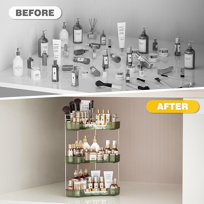 3-Tier Corner Bathroom Counter Organizer with Top Toothbrush Holders,Large Makeup Organizer Countertop with Brush Holder,Skincare Organizers Corner,Exquisite Vanity Organizer (Green, 3 Tier)