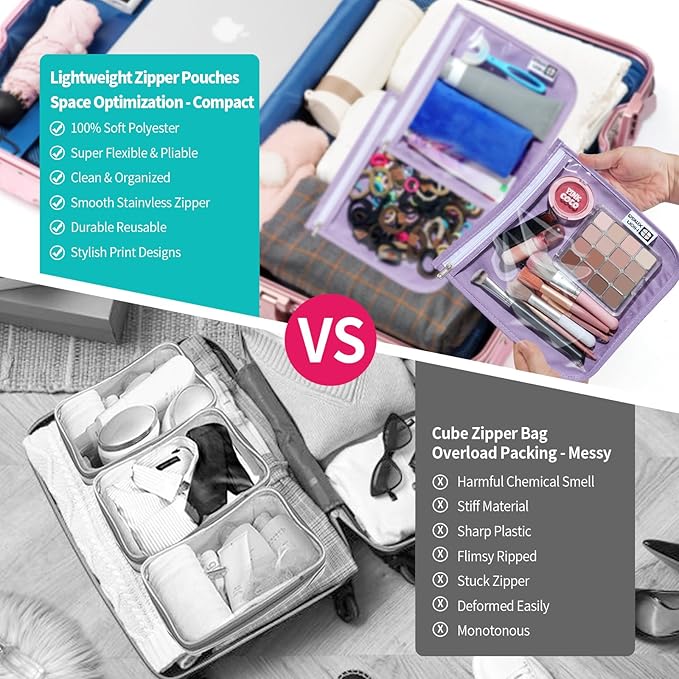 - 100 MORE PURPOSES: Our versatile travel pouch set with playful pattern make your organizing super simple and enjoyable. Compact design in ultra-light takes up very little room in your luggage,playful prints that both kids and adults love! It is perfect to get the clear travel bag for toiletries and cosmetics,also great as a diaper bag organizer to store baby stuff,toys,misc,first aid. Whether home or outing,it is stylish and well-organized