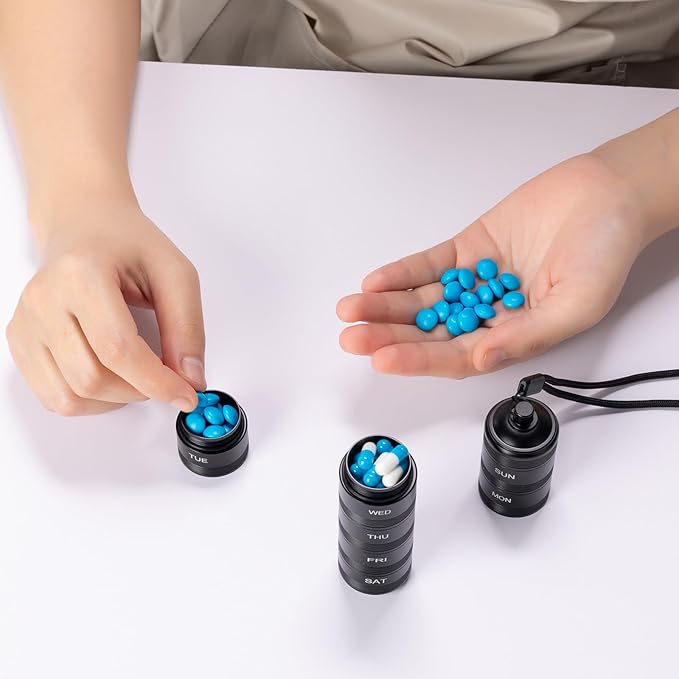 - Portable: Designed for travel, the small pill organizer are compact. They fit easily into handbags, backpacks without adding bulk.Despite their small size, they provide ample space for a week’s worth of small medication, making them convenient for travel.