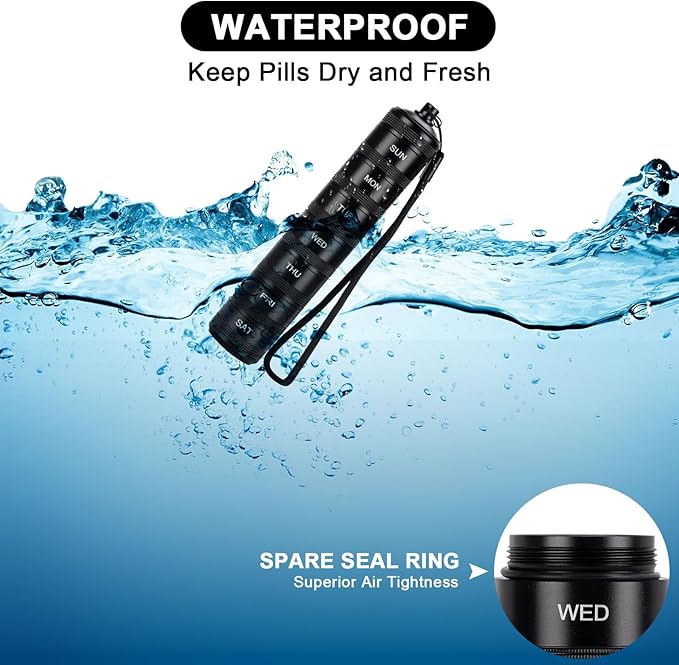 - Waterproof Pill Organizer: Achieved through silicone O-rings that create a secure seal to prevents water, humidity from entering the compartments, ensuring that the medication stays dry and effective. The waterproof capability is essential for travelers, it offers assurance that medications will remain uncompromised regardless of exposure to moisture, thus maintaining their efficacy and reliability.